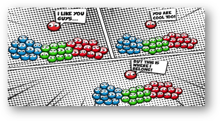 The comic illustration above shows how clustering typically works; similar observations are assigned in the same cluster, whereas dissimilar items are in distinct clusters. How do we compute similarities between objects though? This is what we are exploring in more detail in 1. Distances & Dissimilarities.