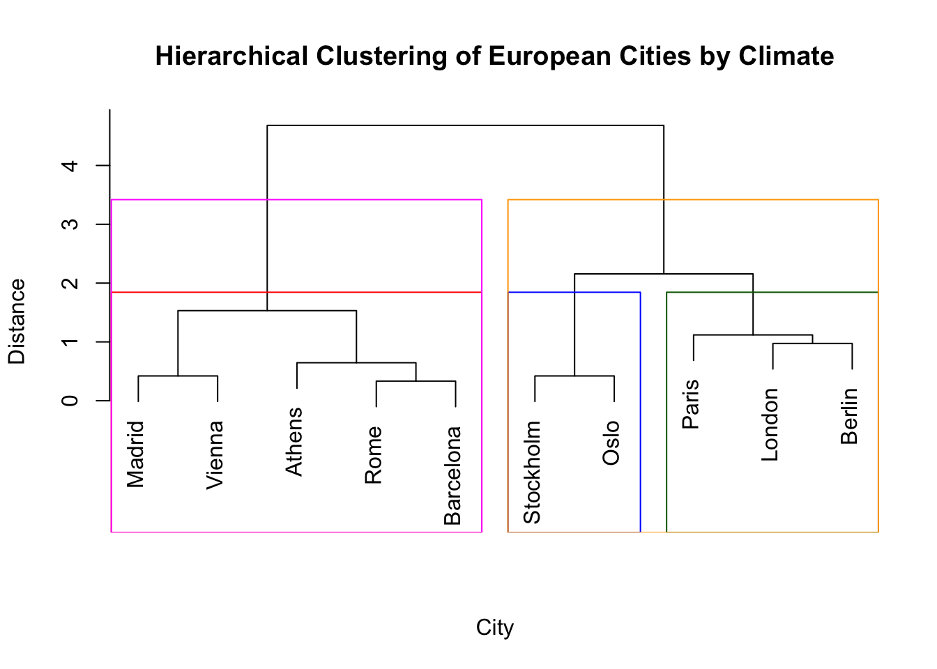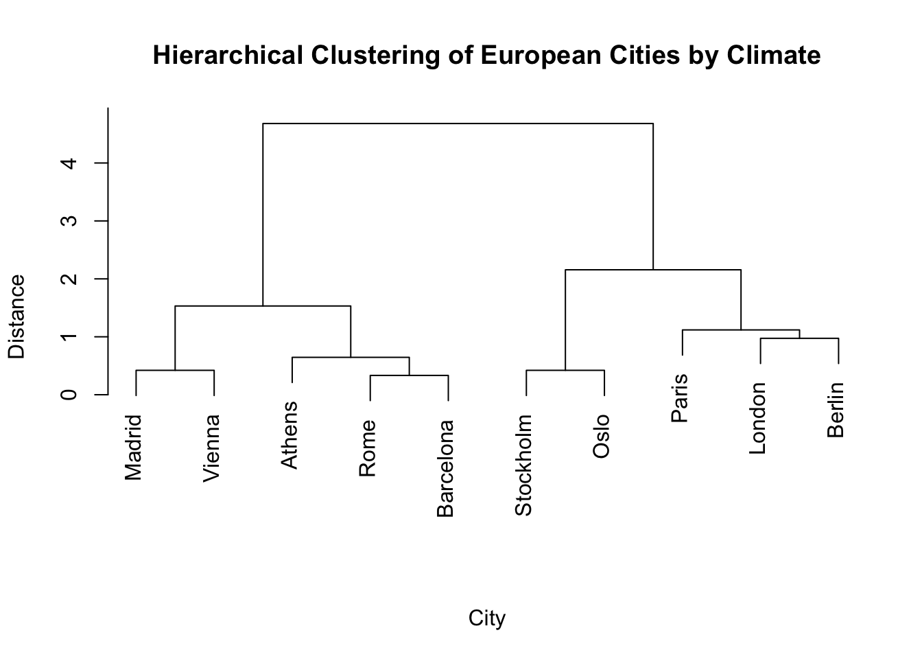 # Create data set of European cities with their climate characteristicscities <-data.frame(avg_temp =c(9, 10, 15, 16, 18, 5, 6, 12, 14, 17),annual_rain =c(600, 750, 500, 450, 400, 800, 850, 650, 550, 480),sunshine_hours =c(1600, 1500, 2500, 2800, 2900, 1400, 1300, 2000, 2400, 2700),row.names =c("London", "Paris", "Madrid", "Rome", "Athens", "Stockholm", "Oslo", "Berlin", "Vienna", "Barcelona"))# Perform hierarchical clusteringdist_matrix <-dist(scale(cities))hc <-hclust(d = dist_matrix,method ="complete")# Plot the hierarchyplot(hc, main ="Hierarchical Clustering of European Cities by Climate",xlab ="City", ylab ="Distance", sub ="")